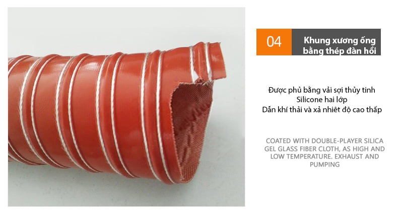 - Ống silicon chịu nhiệt được làm bởi sợi thủy tinh bọc silicon hai lớp gia cố bằng dây thép xoắn lò xo và dây cáp sợi thủy tinh bên ngoài, vì vậy ống sử dụng được ở nhiệt độ cao phù hợp với các ứng dụng xử lý không khí nóng, xả khí và thông gió nhiệt độ cao trong công nghiệp ô tô, lò đốt, nhựa…….
